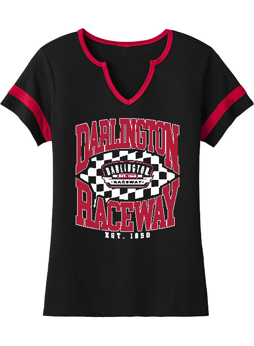 Gear up for race day with this Ladies Darlington Raceway Retro Checkered Collegiate T-Shirt!